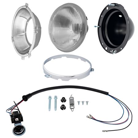 Comes assembled and includes Lucas H4 glass headlamp with backing bowl, chrome rim, adjusters and wiring harness.